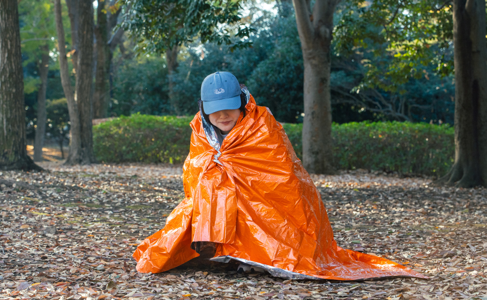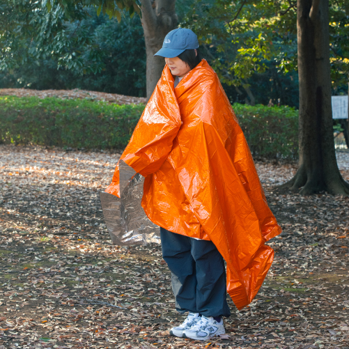 雨、風から身体を守る高い保温性と断熱効果により、輻射熱を反射して体温を保持します。視認性の高いオレンジ色を採用し、災害時や登山・キャンプなど幅広いシーンで活躍します。