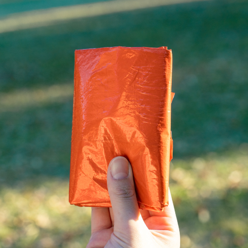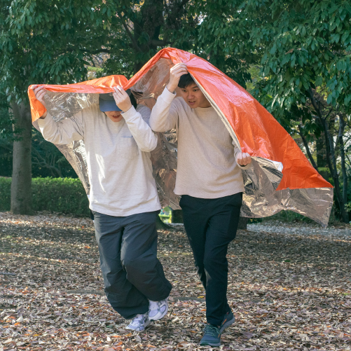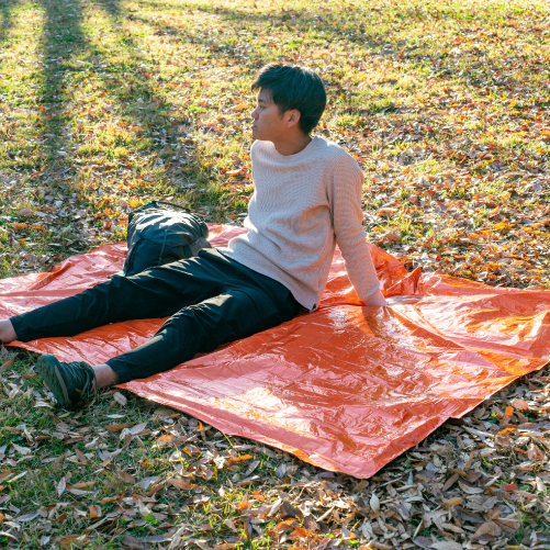 冷気や雨風から体を守る、軽量・コンパクトなマルチシート。巻く・敷く・かける・日よけなど幅広く使え、しなやかな素材でガサガサ音を抑えた静音設計。避難場所でも使いやすく、防災の備えとしても安心です。