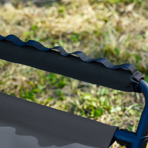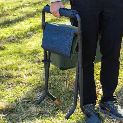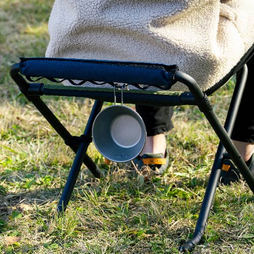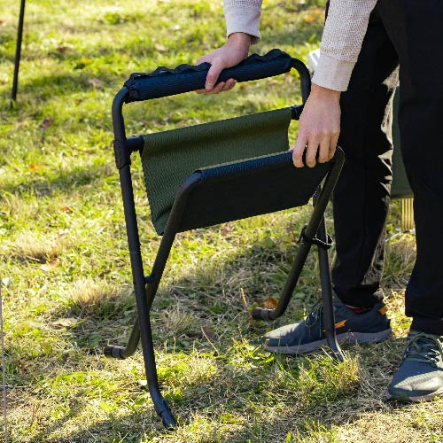 ハイスタイルとロースタイル、2段階の高さ調節で使えるスツールです。座り心地を重視した広い座面で、長時間の使用も快適です。 ハンドルにはギアを取り付けられるベルトループを装備し、機能性も抜群。