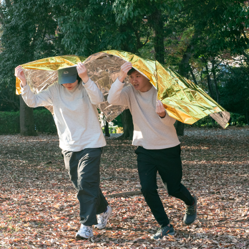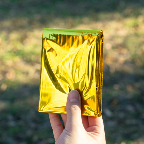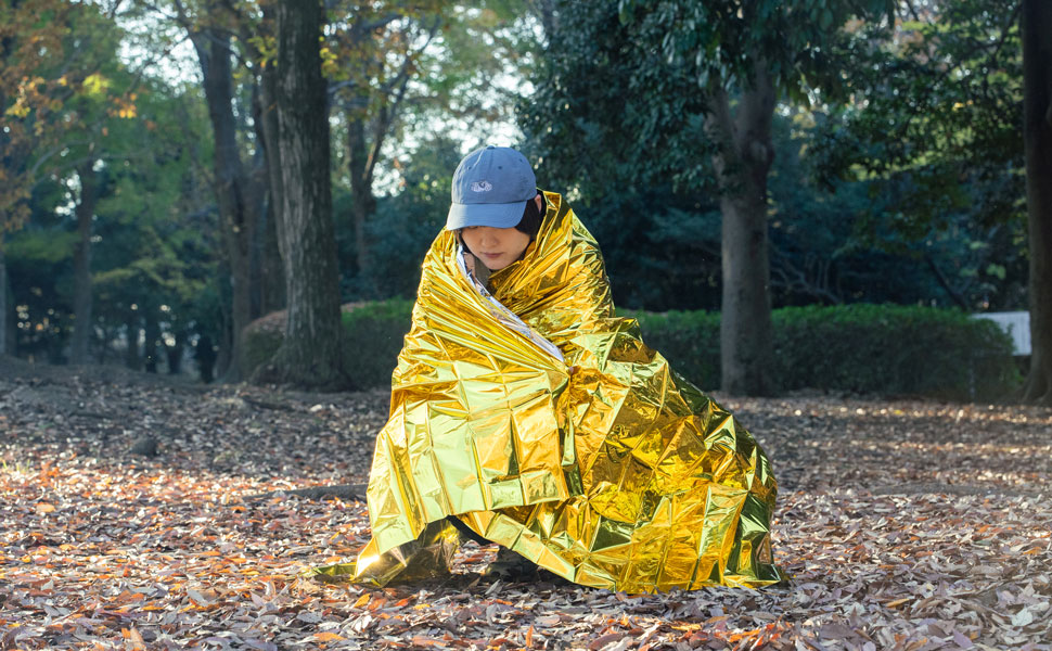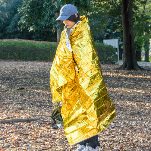 急変する気温の変化や、雨、風から身体を守るための緊急用シートです。熱を吸収する金色と、熱を反射する銀色の性質を応用し、断熱効果を高めます。
