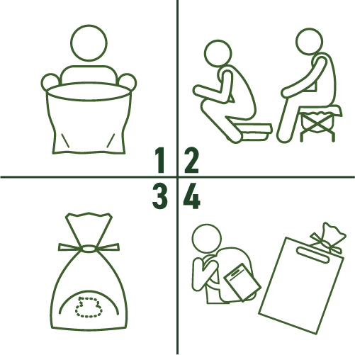 広げたらおまるのように、または便座に被せて使用します。使い終わったら空気を抜いて口を縛り、高密閉チャック袋に入れて完了です。地域のルールに従って処分してください。