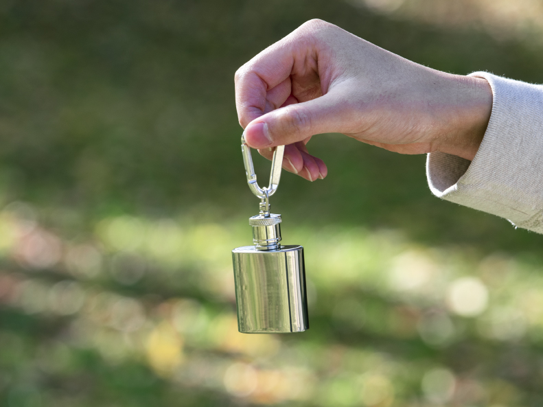 さらにコンパクトなのがフラスコキーホルダー。名前の通りキーホルダーとして携帯できる、超小型サイズのフラスコで、バッグやベルトループ、バックパックなどに取り付けて持ち運ぶことができます。
