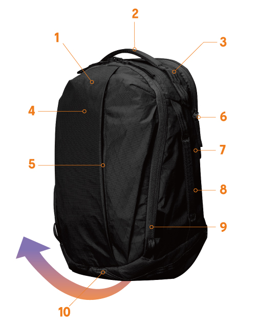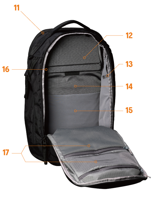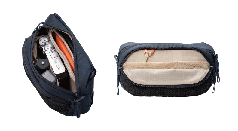 メインコンパートメントには、複数のポケットを搭載。開口部が大きく開く構造で、バッグインバッグとして使用できるCubeや新製品のCore Slingと組み合わせても使える設計です。