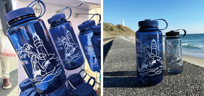 今回はナルゲンボトルの1.0Lサイズを採用し、カラーには「デニム」を選びました。 御前崎市在住のアーティスト・Jiro氏による、御前埼灯台をモチーフにしたデザインと、御前崎の澄んだ海や空を思わせる深いブルーの色合いが調和し、魅力的な一本に仕上がっています。 今後、こちらのボトルも御前崎灯台下の御前崎渚の交番などで販売予定です。