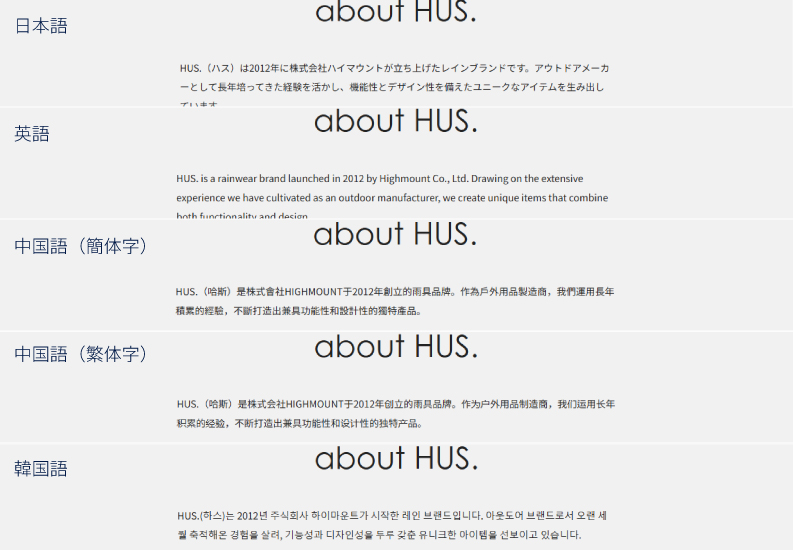 一般のお客様はもちろん、小売店様や法人のお客様に向けたブランド情報発信の拠点として、HUS.の魅力や最新情報をわかりやすくお伝えします。